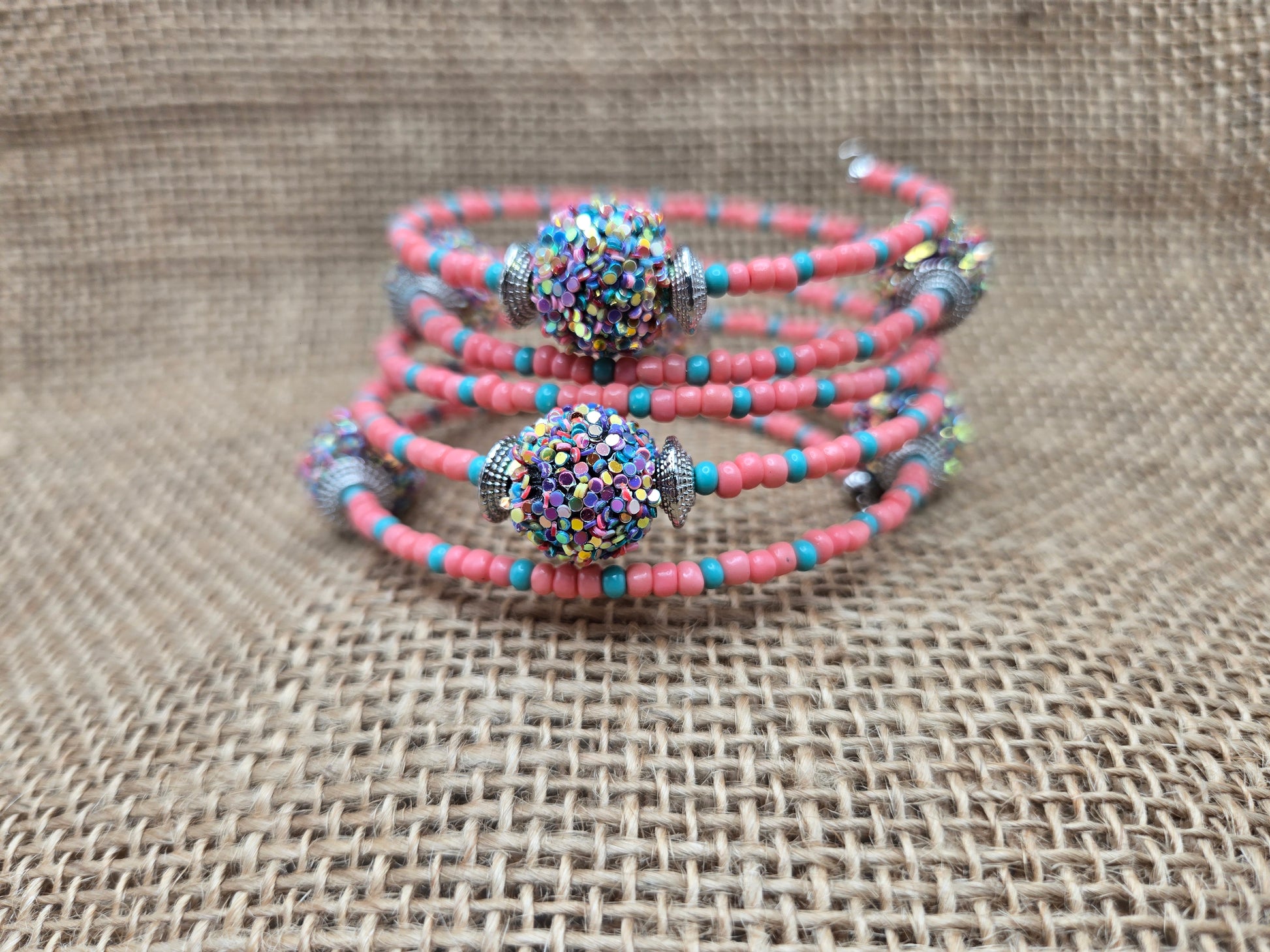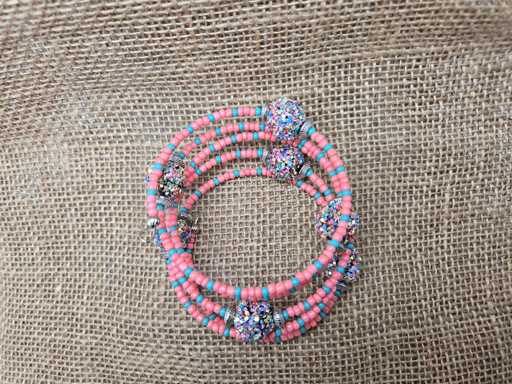 Five wrap memory wire bracelet with shades of pink and turquoise. The center beads are fun like balls of blingy confetti with silver toned accents. Stainless steel finish and looks good enough to eat.