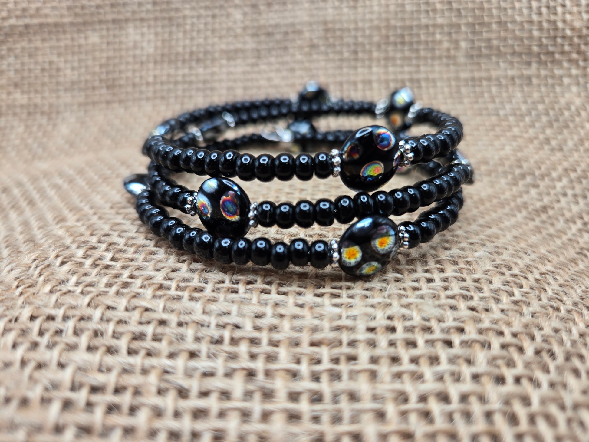 Three wrap memory wire bracelet with high polished black seed beads and fun little black discs with dots that look like gas spills on black top. Fun, fun, fun.