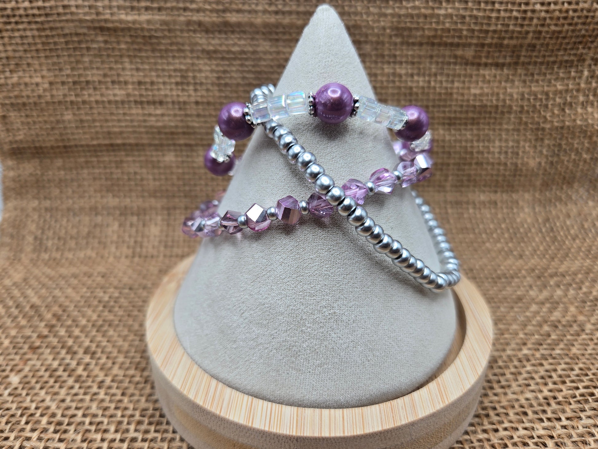Monica is a set of three bracelets offering iridescent cube beads, lavender miracle beads that look like they are glowing, lavender crystal beads and silver colored seed beads. The bracelets are set on double threaded stretch cord measuring approximately 7 inches prior to stretching.